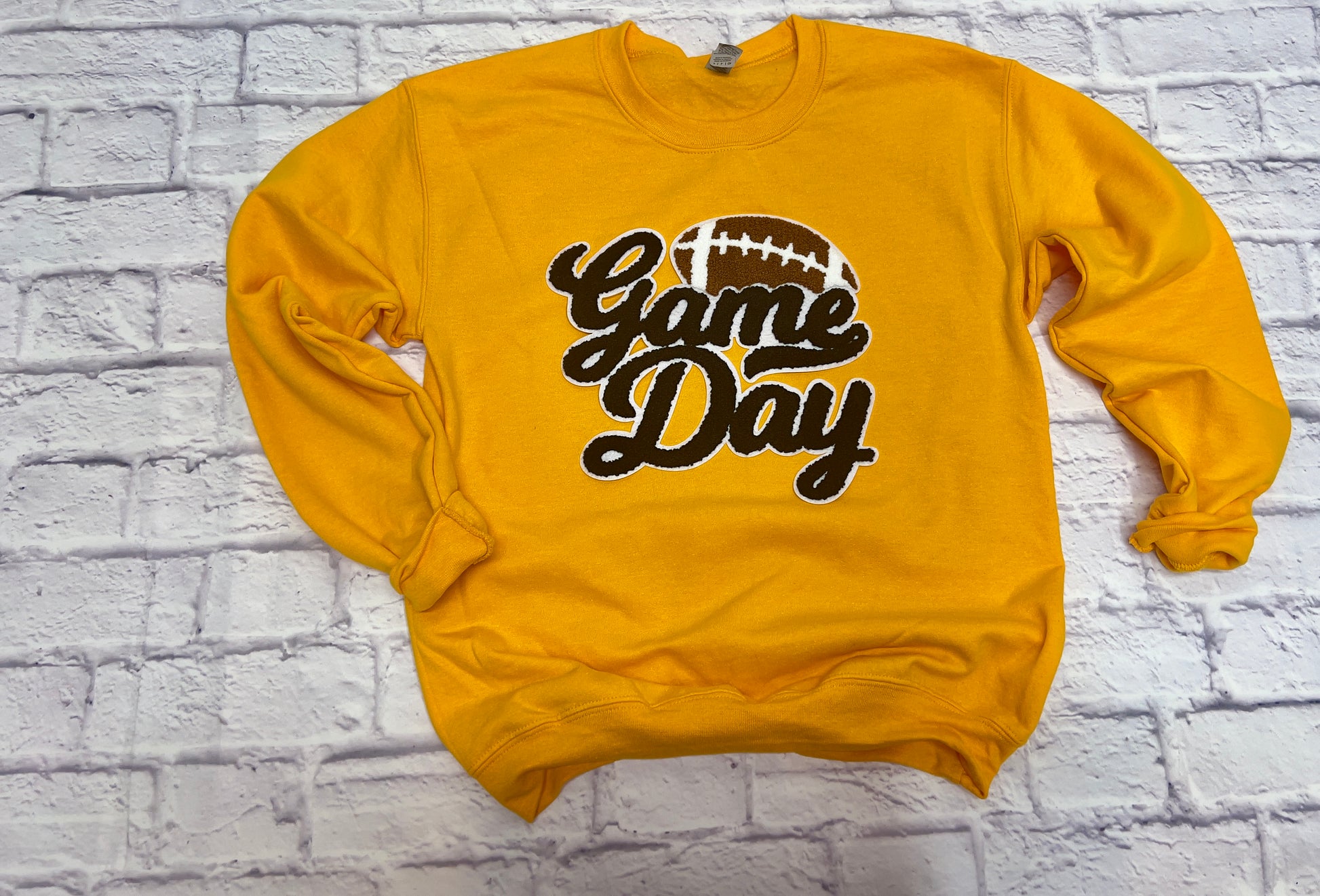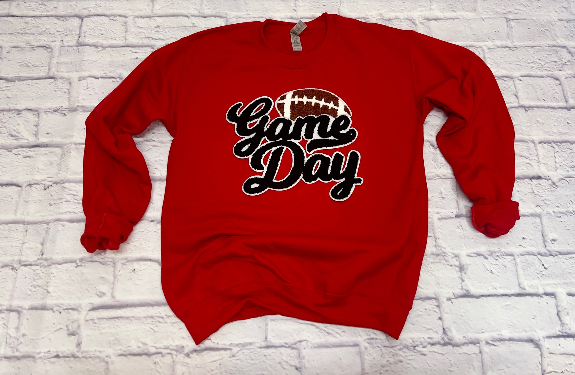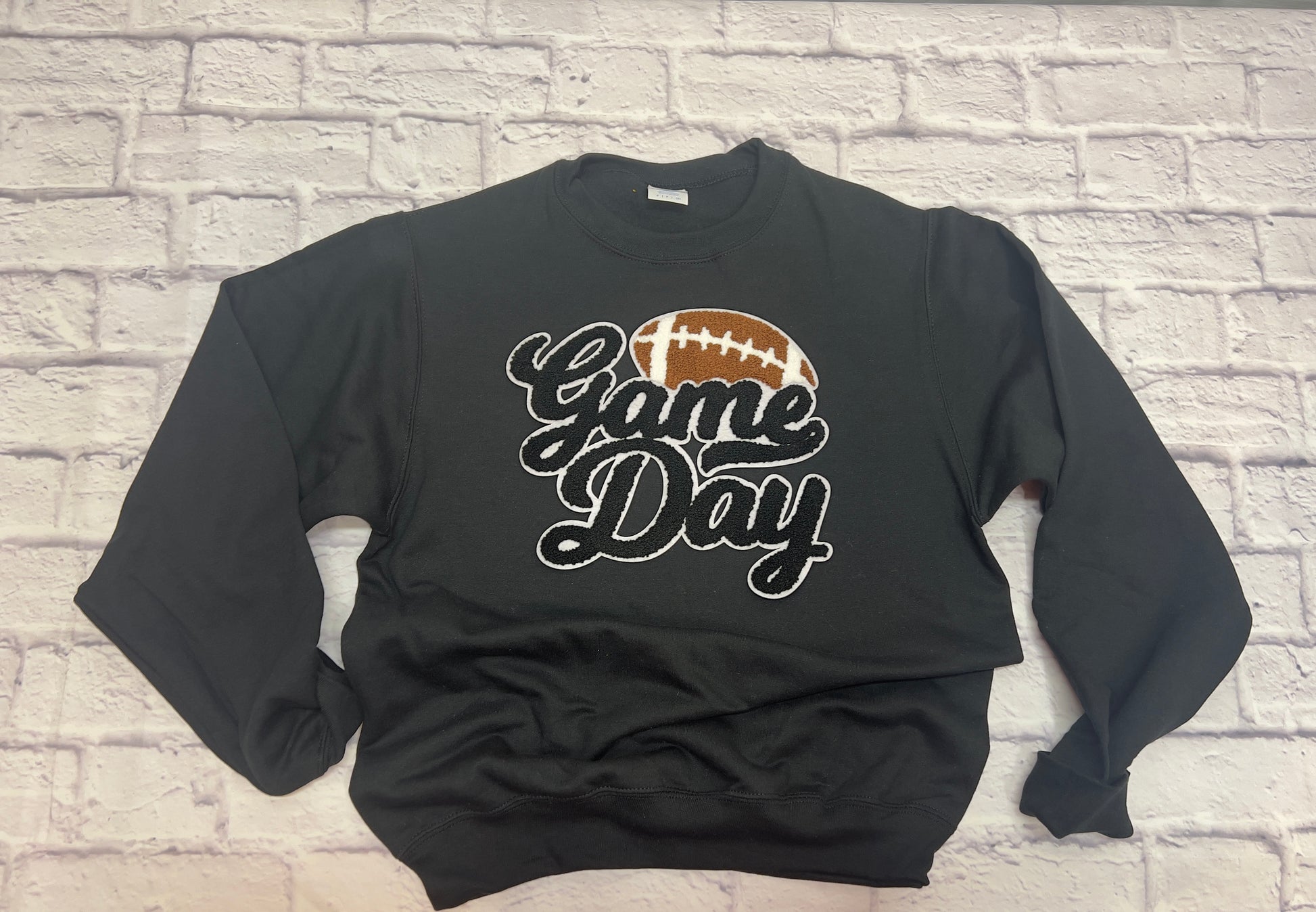 Add some sporty flair to your outfit with our Football Game Day! sweatshirt This customizable crewneck sweatshirt comes in many color options and features a playful chenille patch.